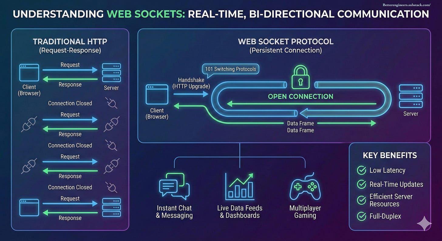 Real-time features are no longer optional. Chat apps, live tracking, notifications, collaborative editors โ all of them rely on WebSockets to push data instantly.