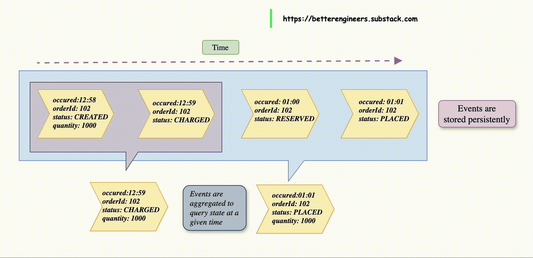 Each of these events is stored in an event store with a timestamp and other metadata. Over time, the store could look like this: